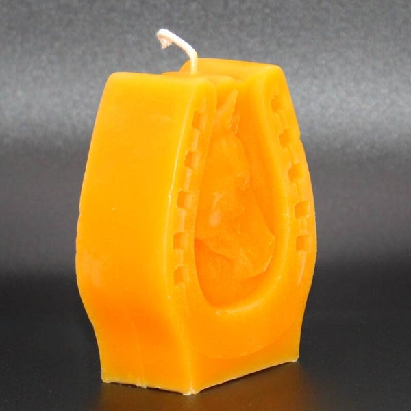 Unsere Kerze in Hufeisenform mit detailreichem Pferdekopf vereint symbolisches Glück und handwerkliche Eleganz in einem besonderen Design. Aus 100 % reinem Bienenwachs gegossen und auf einer passenden Holzplatte arrangiert, ist sie ein dekorativer Blickfang mit Bedeutung. Mit ca. 6,5 × 8 cm Größe und einem Gewicht von rund 130 g eignet sie sich perfekt als Geschenk oder Glücksbringer.