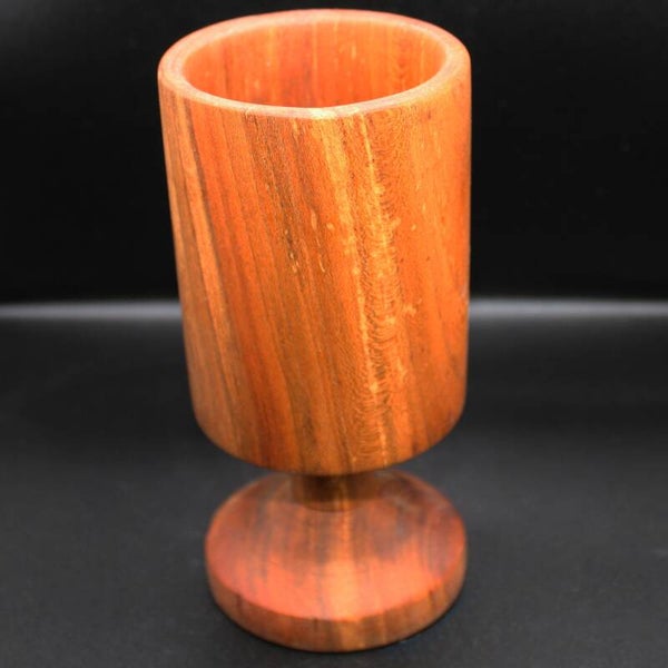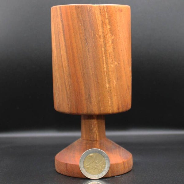 Dieser handgefertigte Kelch aus massivem Holz vereint schlichte Eleganz mit einer außergewöhnlichen Form. Der zylindrische Kelch ruht auf einem markant geformten Fuß, der an eine stilisiertes minimalistisches Weinglas erinnert – und verleiht dem Stück einen zugleich stabilen und skulpturalen Charakter.