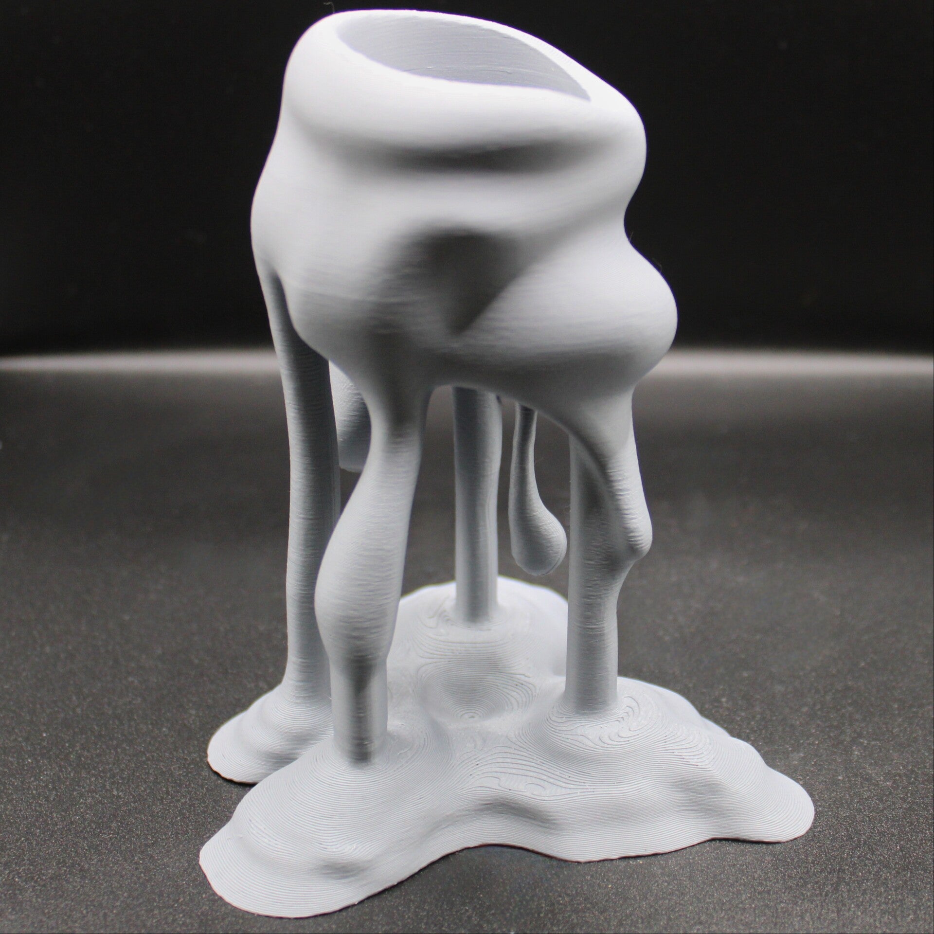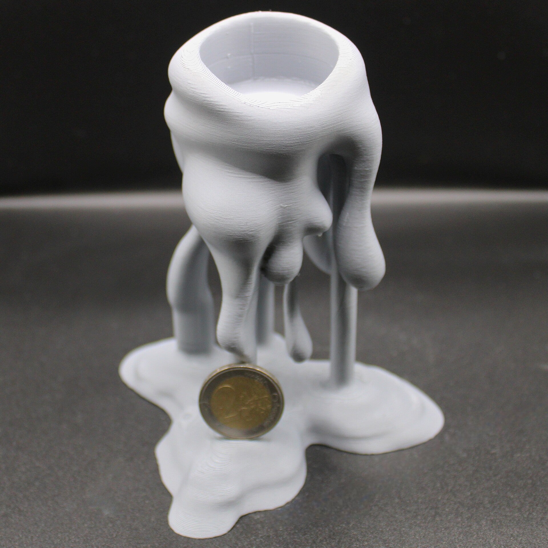 Wie erstarrtes Wachs fließt dieses Design förmlich in den Raum: „Der Geschmolzene“ ist ein außergewöhnlicher Teelichthalter aus dem 3D-Druck, der durch seine organische Form und die scheinbar flüssige Struktur sofort ins Auge fällt. Trotz seines Namens bleibt er standhaft – und bringt jedes Teelicht stimmungsvoll zur Geltung.